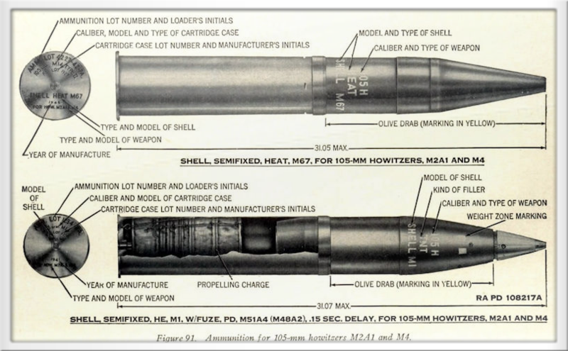 Amerikanische 105 mm Granaten, die vom M2A1 Geschützen verschossen wurden.