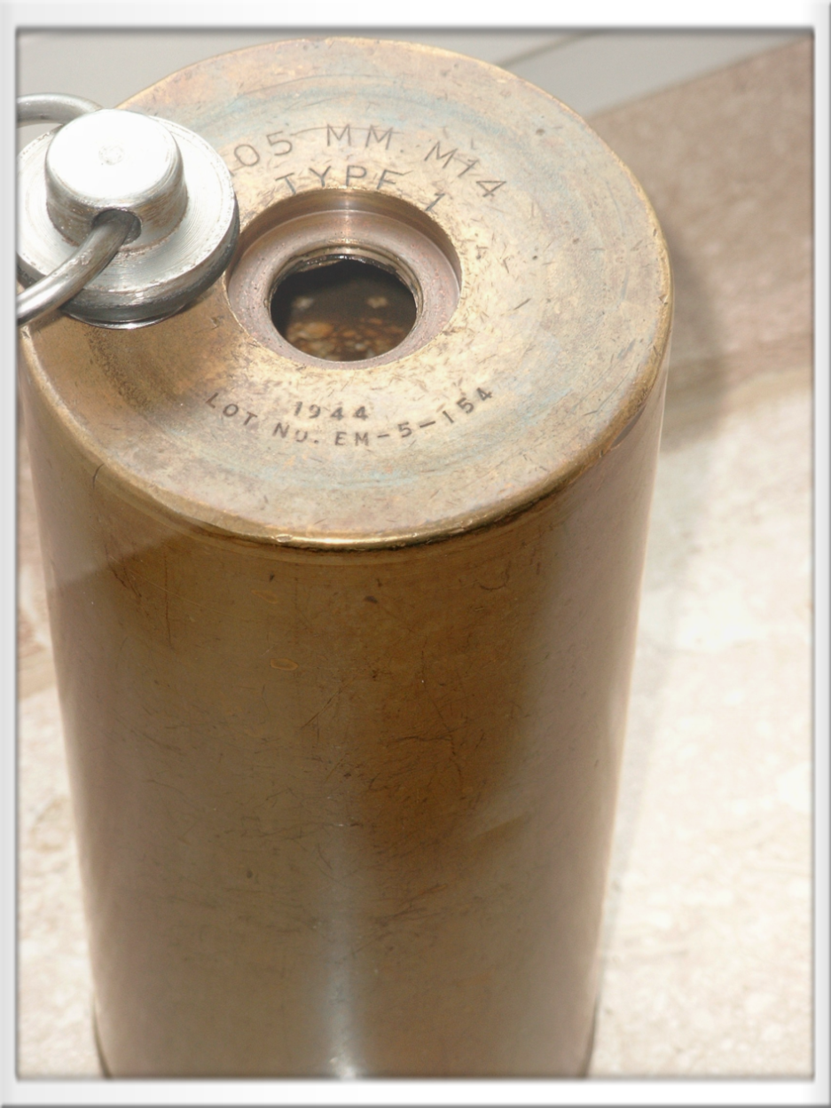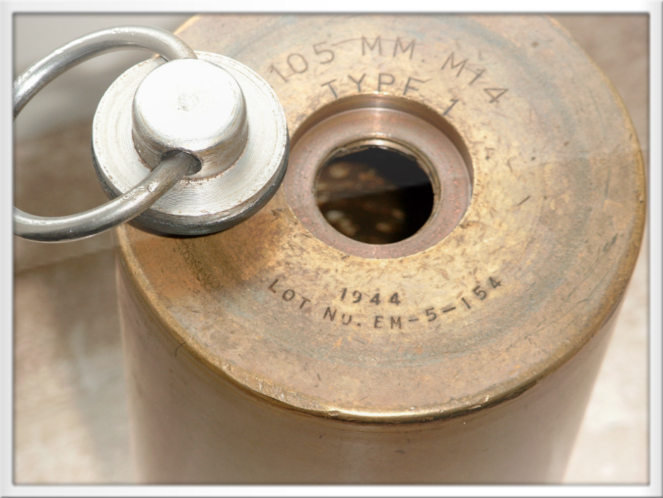 Kartusche mit Schraubverschluß, aus der Beschriftung kann man entnehmen, dass die 105 mm Granate 1944 hergestellt wurde.
