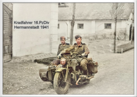 Kradfahrer der 16. Panzer-Division in Hermannstadt, Rumänien 1941