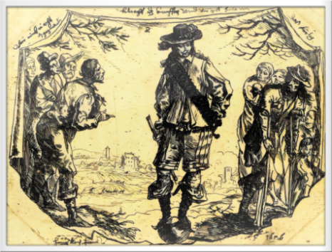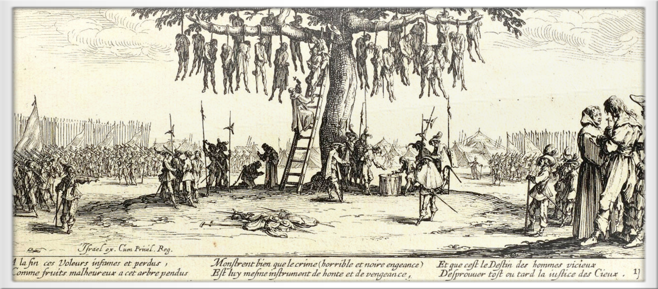 Der berühmte Galgenbaum – Darstellung von Kriegsgräueln nach Jacques Callot (1632) aus Jacques Callots Serie "misères de la guerre" wurde zum Symbol des Dreißigjährigen Krieges