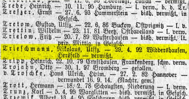 Gefallene Kriegsteilnehmer 1914-1918 aus Widdershausen |