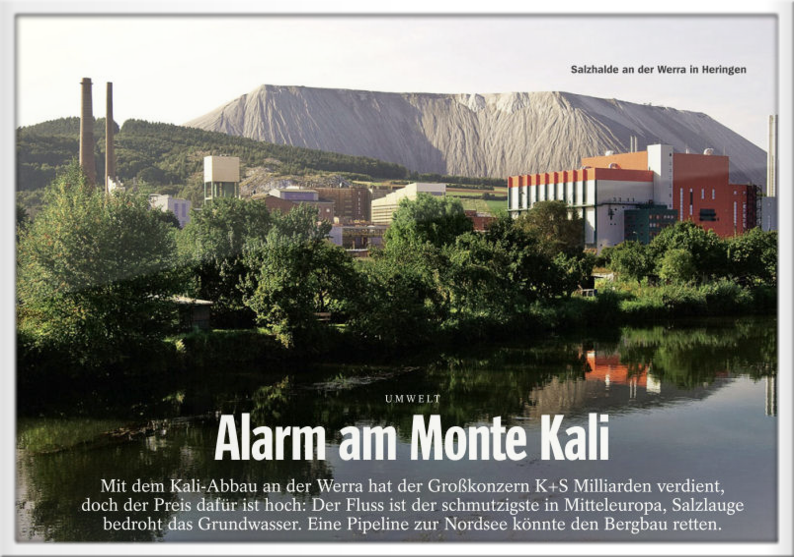 Doch die Behörden, die bislang großzügig die Einleitung der Abwässer genehmigten, stehen mittlerweile unter Druck durch neue Wasserschutzvorschriften und EU-Richtlinien. Hinter verschlossenen Türen wird deshalb um eine Lösung gerungen. Es geht um ein kühnes Großprojekt zur Rettung des Kali-Bergbaus. Eine Pipeline über Hunderte Kilometer könnte in Zukunft das Salz in die Nordsee schwemmen.