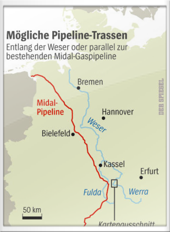 Zwei mögliche Trassen sind denkbar. Entweder soll die Salzlauge parallel zur bestehenden Gaspipeline Midal diagonal durch Norddeutschland nach Emden oder aber entlang der Weser führen. Noch allerdings weiß niemand, wie viele Natur- und Vogelschutzgebiete dafür durchquert werden müssten. Nun soll eine Machbarkeitsstudie in Auftrag gegeben werden.