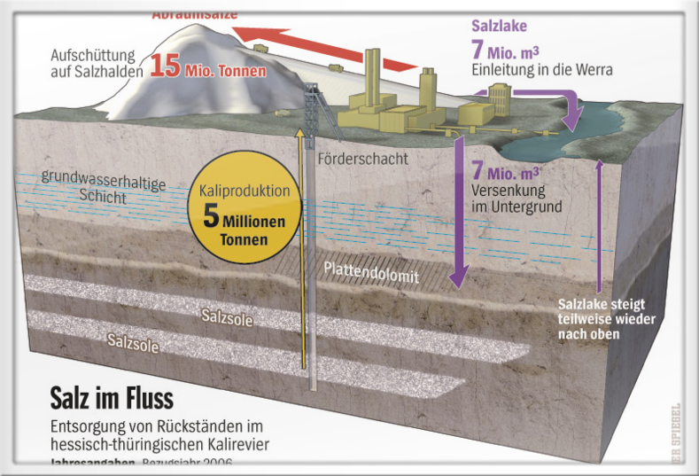 Doch mit jeder Tonne Kali, die aus dem Untergrund kommt, wächst auch die Umweltbelastung der Region. Bei der Produktion entstehen salzhaltige Abwässer, die von den Bergleuten seit langem in den Fluss geschüttet oder in den Boden gepumpt werden. Das hat sich seit hundert Jahren nicht geändert.