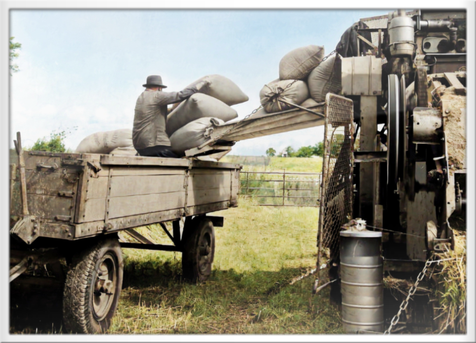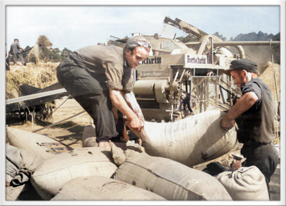 Umladen der Kornsäcke war eine mühevolle Arbeit, hier von einem Mähdrescher auf einen Transportwagen 1965