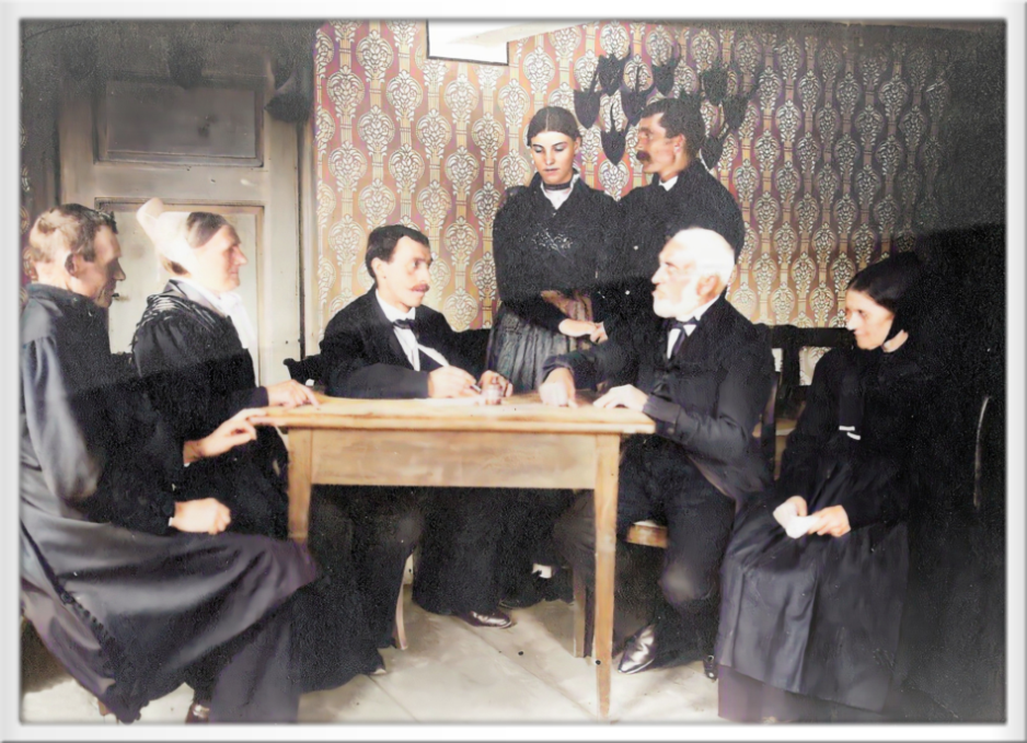 Altenteil – Übergabe an die nächste Generation - Vertragsunterschriften, Foto Friedrich Maurer, Der Handstreich, das Festsetzen des Leibgedings vor der Hochzeit, 1908