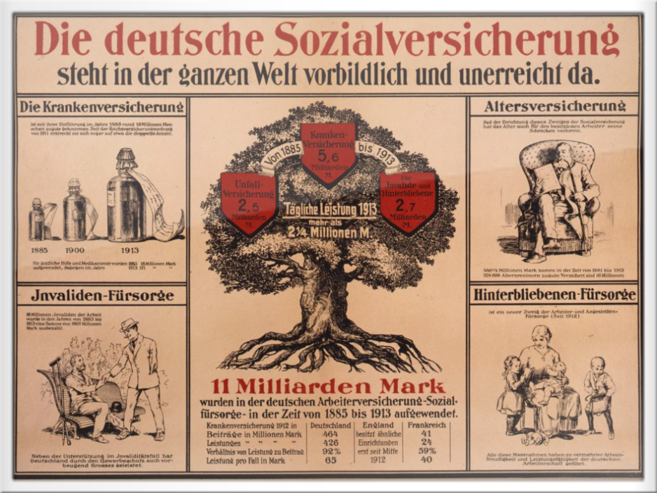 Solche privaten Initiativen alleine konnten jedoch der Altersarmut ganzer Bevölkerungsschichten nicht entgegenwirken. Gleichzeitig jedoch begannen Arbeiter*innen und Angestellte sich immer stärker zu organisieren und heute als selbstverständlich geltende Rechte einzufordern. Vor diesem Hintergrund sah sich auch ein erzkonservativer Reichskanzler Bismarck dazu gezwungen, gleichzeitig zu seinen repressiven Sozialistengesetzen die weltweit erste gesetzliche Renten- und Krankenversicherung einzuführen. 1883 verabschiedete der Reichstag das Gesetz für eine allgemeine Krankenversicherung, ein Jahr später eines zur Unfallversicherung, während die allgemeine Rentenversicherung schließlich 1889 eingeführt und ab 1891 ausgezahlt wurde.