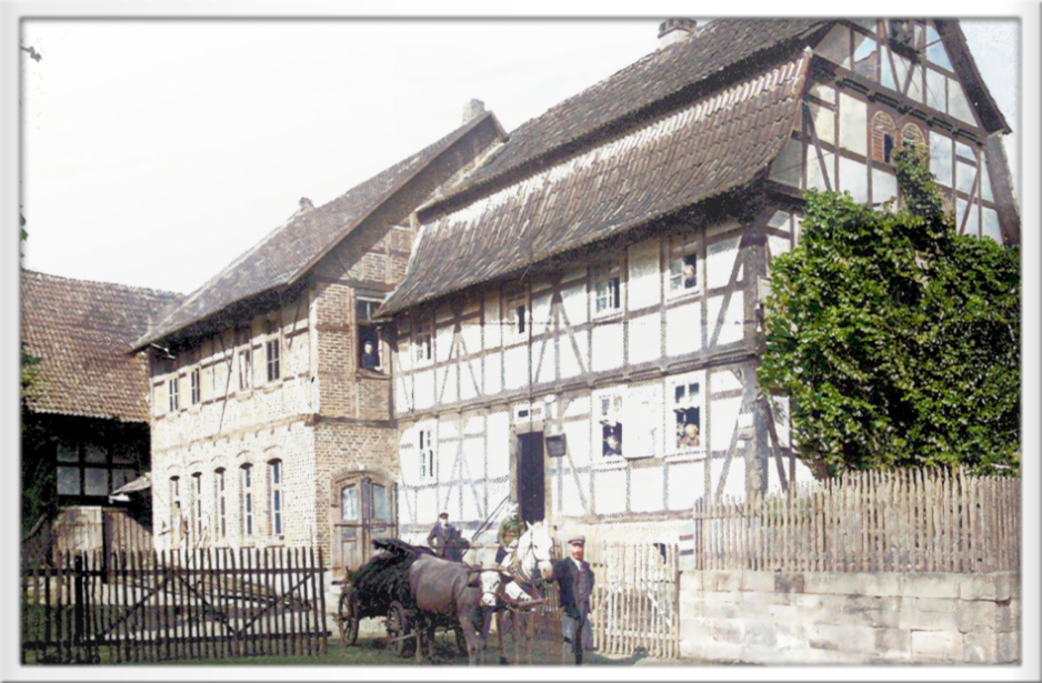 Ehemaliges Anwesen der Land- und Gastwirtschaft Ruch später Führer in Widdershausen neben der evangelischen Kirche, Aufnahme vom 1912, zu diesem Hof gehört das Auszügerhaus