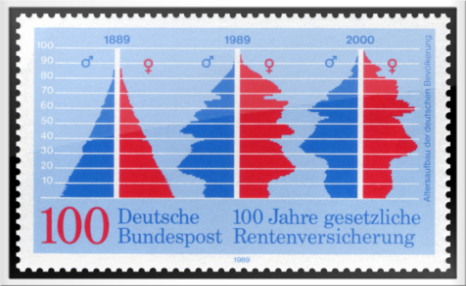 100 Jahre gesetzliche Rentenversicherung 1889-1989, Altersaufbau der deutschen Bevölkerung, Briefmarke, 100 Pfennige, Deutsche Bundespost, 1989