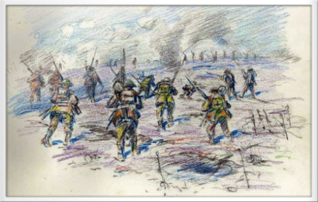 Englischer Angriff auf den Kreidefelsen (Butte de Warlencourt) bei Le Sars vom 5. November 1916, by Robert Mc Mauchlen MC (1885-1972), (Sketchbook in the Battle of the Somme archives of Durham County Record Office)