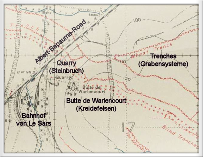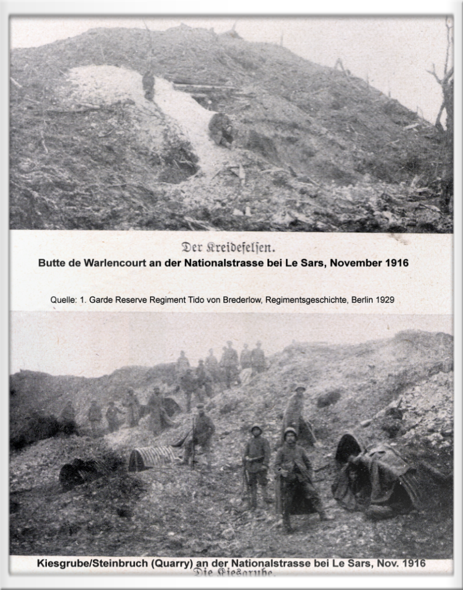 Die deutschen Stellungen am Butte de Warlencourt (Kreidefelsen) und der benachbarte Steinbruch (Quarry) entnommen aus der Regimentsgeschichte 1. Garde Reserve Regiment, Berlin 1926