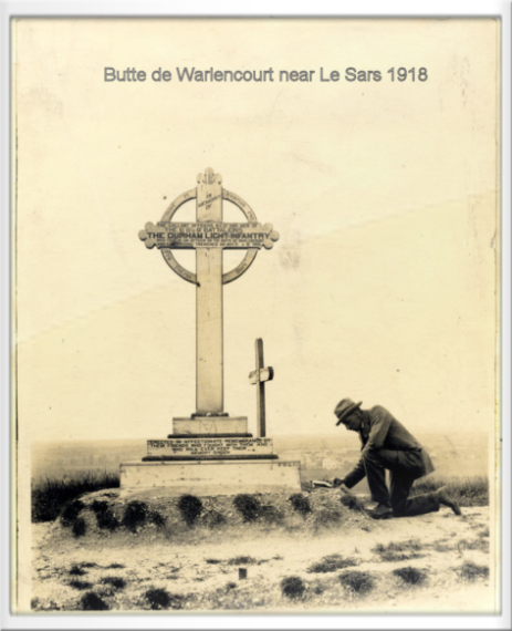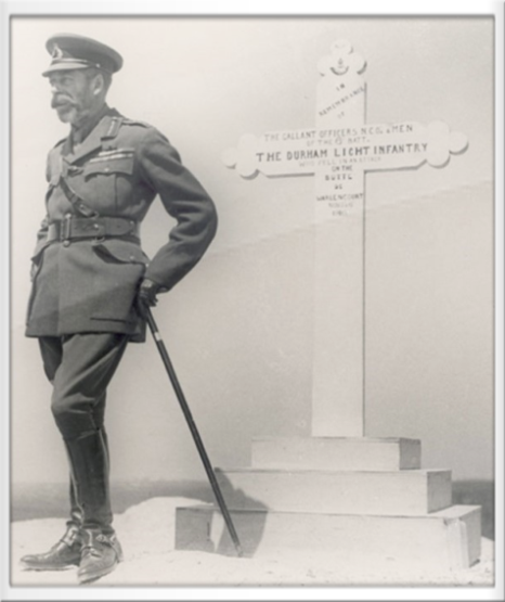König George V besuchte den Butte de Warlencourt im Juli 1917 - hier steht er vor dem Holzkreuz der Durham Light Infantry