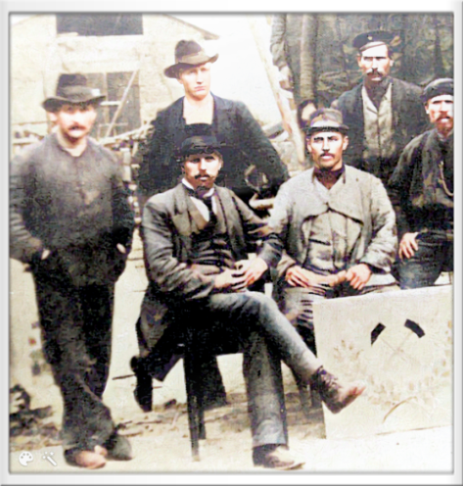 August Rosterg (in der Mitte sitzend) auf einem Belegschaftsfoto während der Abteufzeit des Schachtes Grimberg