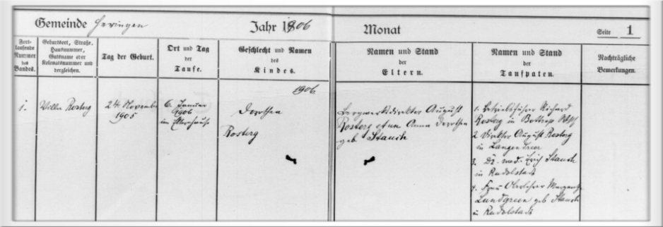 Taufbucheintrag von Thea Rosterg vom 06.01.1906 im Heringer Taufbuch