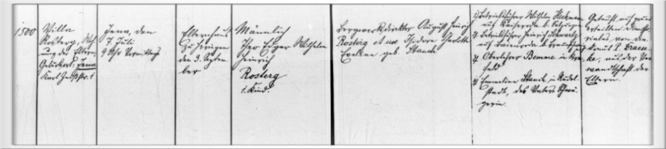 August Rostergs Tochter Thea (Dorothea) Rosterg wurde am 24.11.1905 in Heringen an der Werra in der Villa Rosterg geboren und am 6.1.1906 auch im Elternhaus in Heringen getauft. Taufpaten waren: Betriebsführer Richard Rosterg in Bottrop (des Vaters Bruder), Direktor August Rosterg in Langendreer, Dr. med. Erich Stauch in Rudolstadt in Thüringen, Frau Oberlehrerin Margarete Lundgreen geb. Stauch in Rudolstadt.
