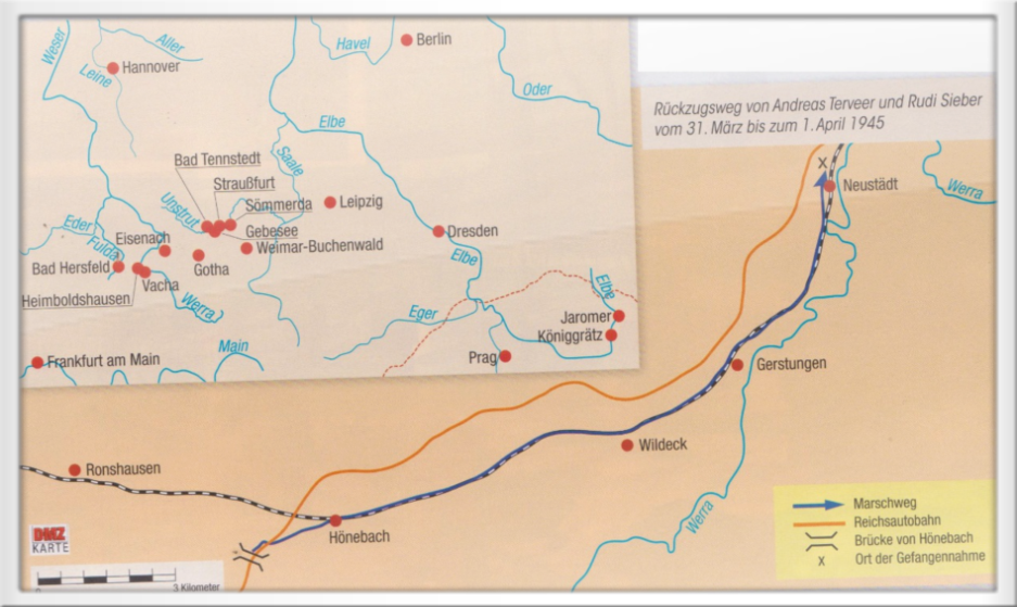 Rückzugsweg von Andreas Terveer und Rudi Sieber vom 31. März bis zum 1. April 1945 von der Brücke bei Hönebach bis zur Gefangennahme nach Neustädt