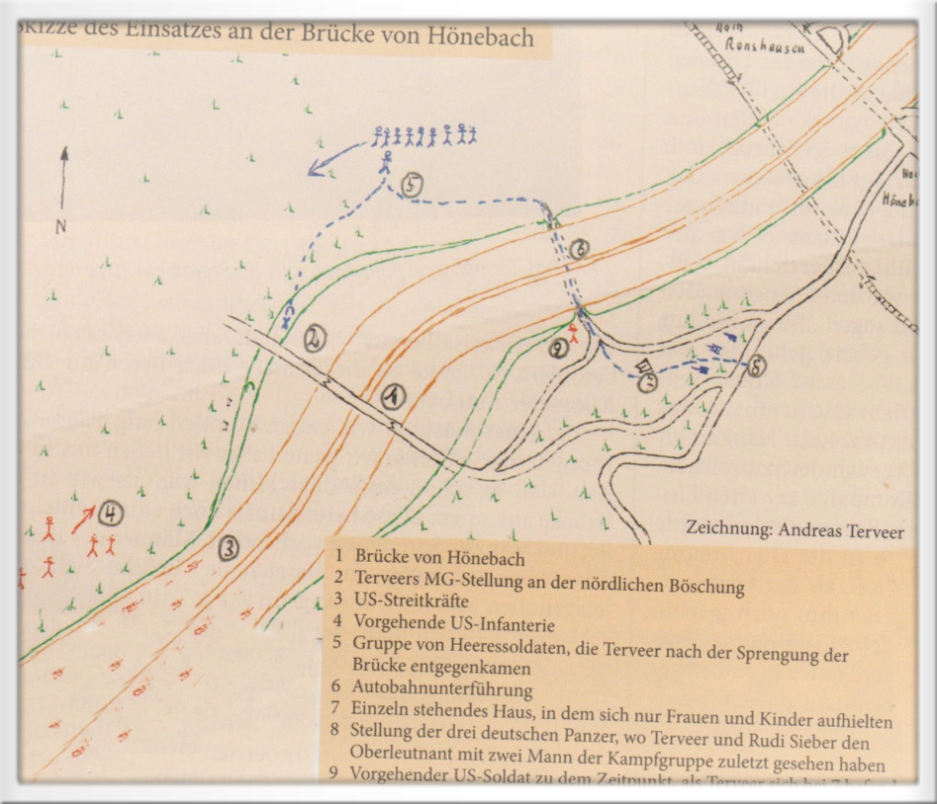 Andreas Terveer hat als Augenzeuge die Ereignisse an der Brücke miterlebt, er war im Oktober 1943 zur Waffen-SS eingezogen und im Februar 1945 von Berlin nach Thüringen verlegt worden, wo er als ehemaliger Grenadier bei der Feldgendarmerie ausgebildet wurde. Am 27. März 1945 gab unser Lehrgangsleiter bekannt, dass für den Einsatz gegen die an der Autobahn Frankfurt – Eisenach vorgehenden US-Streitkräfte Freiwillige gesucht würden, um ihnen eine Kampfgruppe entgegenzuwerfen.