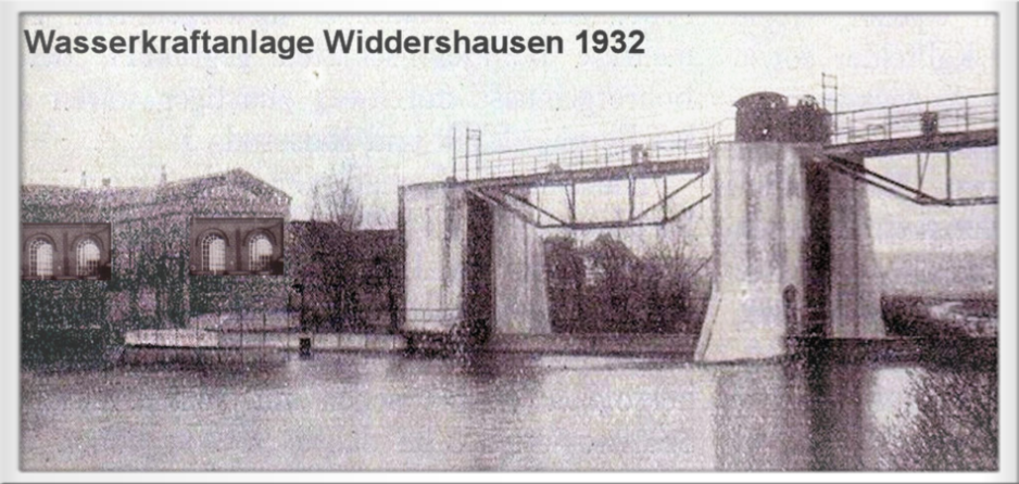 Wasserkraftanlage des Kaliwerkes Wintershall an der Werra in Widdershausen 1932, hier noch mit den drei Betonsockeln von 1904