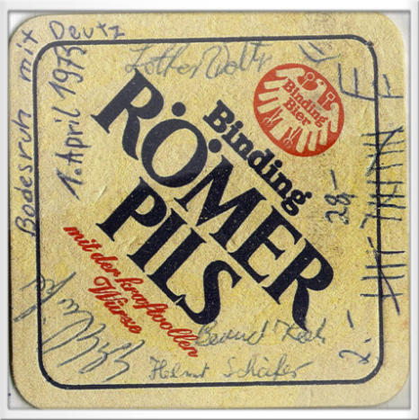 Bierdeckel als Erinnerung an eine Treckerfahrt nach Bodesruh am 1. April 1973, Teilnehmer: Bernd Koch, Helmut Schäfer Lothar Schäfer und Lothar Walter