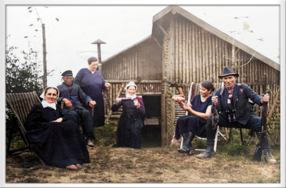 Sonntags-Ausflügler aus Kleinensee oer Obersuhl hinter dem alten Jagdhaus Bodesruh, hier noch als Holzhütte mit den damaligen Reklameschilern