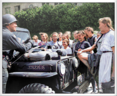 SFC Hagen with his patrol stops to adjust straps on jeep as young Geman girls leaving school for the day surrond him near Bad Hersfeld.