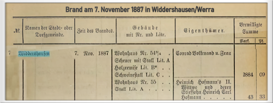 Im Amtsblatt der Regierung in Kassel im Regierungsbezirk Kassel von 1890 ist der Brand vom 7. November 1887 in Widdershausen aufgeführt.