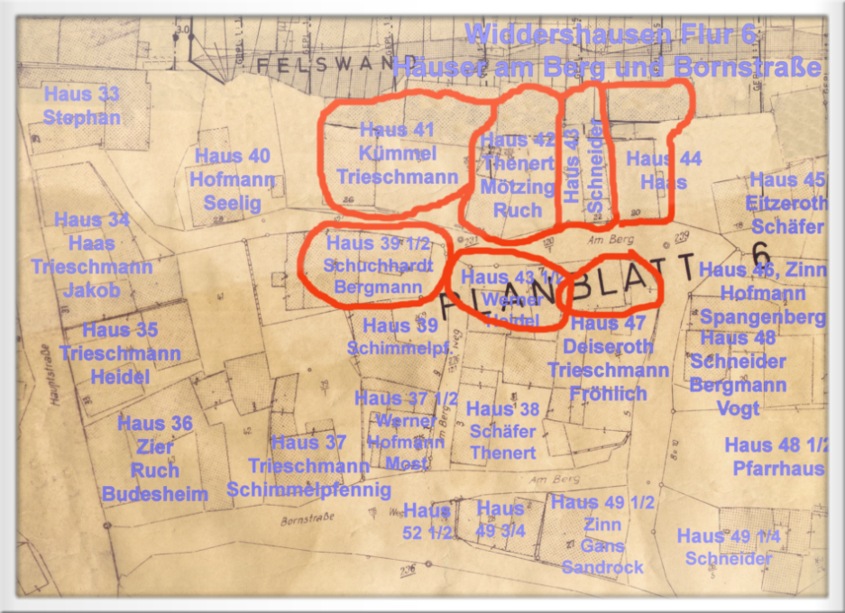 Vom Großbrand am 27. Oktober 1868 betroffene Gebäude in Widdershausen, auf dem Berge, Katasterblatt 6