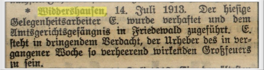 Großbrand in Widdershausen - Verhaftung eines Verdächtigen vom 14. Juli 1913