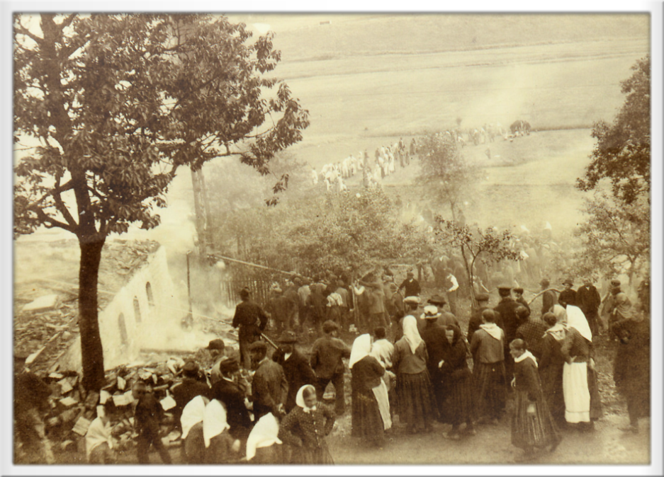 Zahlreiche Dorfbewohner eilten 1913 zum Brandort in Brandoberndorf und beteiligten sich an den Löscharbeiten. Die Aufnahme zeigt eine Menschenkette von der Mühle bis hinunter zum Solmsbach, mit deren Hilfe das Löschwasser in Feuereimern herantransportiert wurde. Auch in Widdershausen hat es 1913 eine Menschenkette von der Werra bis zu den brennenden Scheunen gegeben.