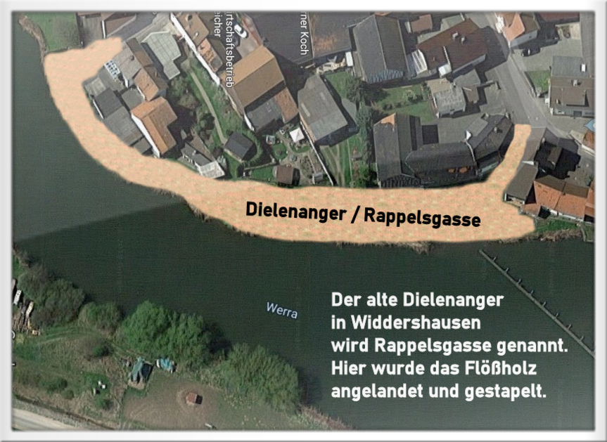 Der alte Dielenanger in Widdershausen wird schon immer die Rappelsgasse genannt. Hier wurde das Flößholz angelandet und gestapelt.