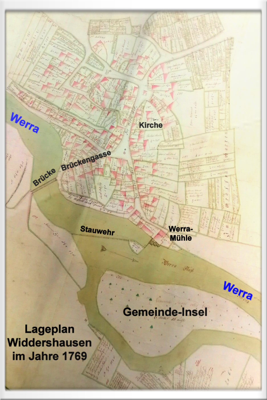 Gesamtes Dorf Widdershausen mit Brücke in der Brückengasse, Gemeindeinsel mit Seitenarm der Werra, Mühle und Kirche im Jahre 1769, auch die Gänsegasse ist im Plan eingezeichnet