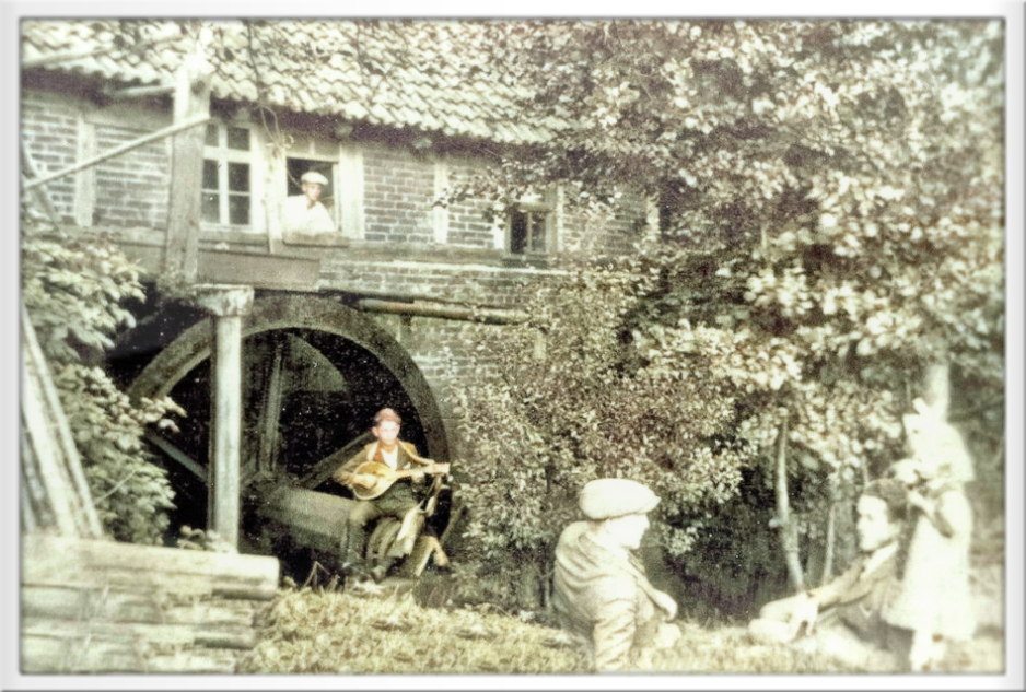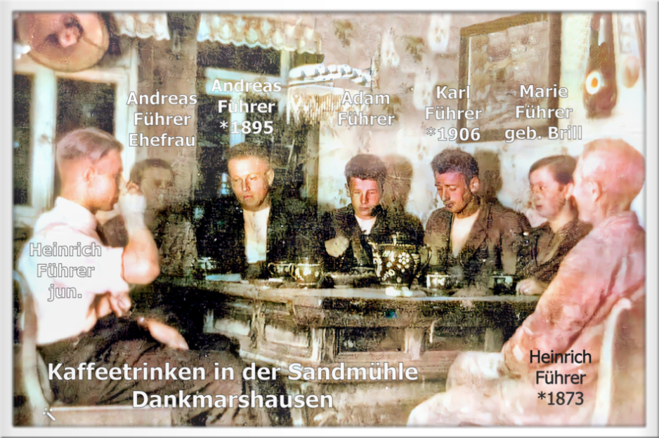 Kaffeetrinken in der Sandmühle, ganz rechts der Vater Heinrich Führer, seine Schwiegertochter Marie, geb. Brill, sein Sohn Karl (der letzte Müller) Sohn Adam, Sohn Andreas mit Frau, Sohn Heinrich. Es fehlt Hans Führer.