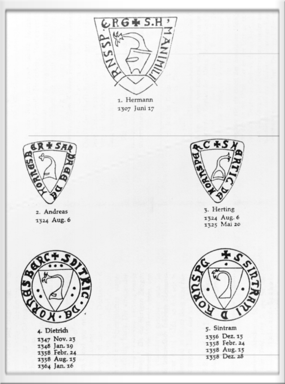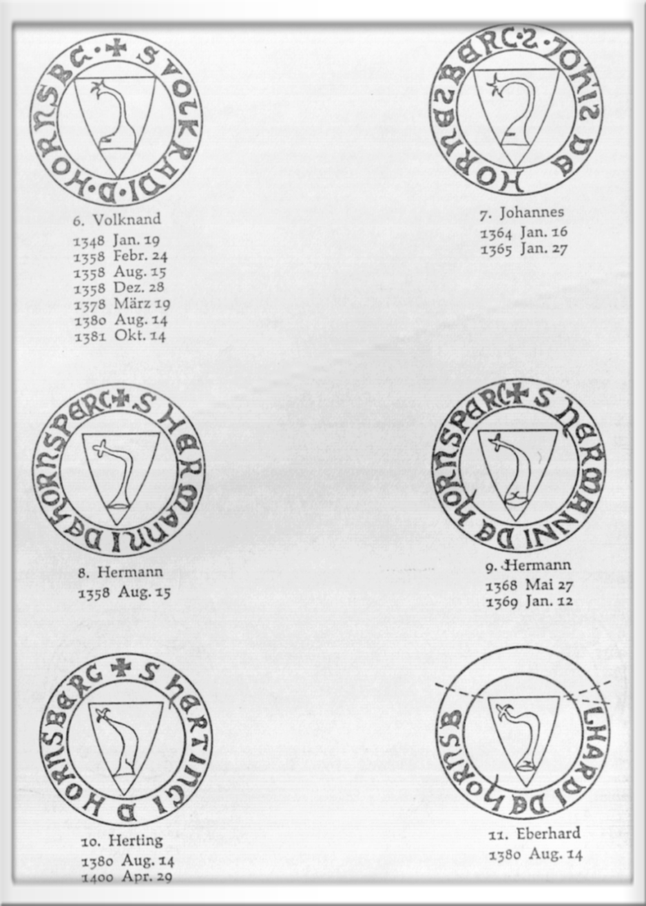 Als nächstes Glied der Familie führen die Urkunden Albert von Hornsberg vor; er war Probst des Klosters auf demJohannesberg bei Fulda von 1273-1306 (Schannat, Diocesis et Hierarchia Fuldensis); ein Bruder Alberts, Heinrich II., empfängt als fuldischer Dienstmann im Jahre 1300 und 1303 Lehngüter von der Abtei Zella, Ebenau und Buchenau. Hermann I. von Hornsberg, ein weiterer Bruder Alberts, findet sich um dieselbe Zeit etliche mal als Urkundenzeuge; er war Vogt in Kreuzburg (v. Boineburgisches Kopialbuch, StAM Reg.Nr.203b). Als Mitgift für seine Tochter, die Klosterjungfrau geworden ist, übermacht Konrad von Hornsberg, Heimrads Sohn, im Jahre 1310 dem Kloster Kornberg Grundstücke im Hübetal (Schmincke, Geschichte des Klosters Kornberg, Seite 184, Hess.Zeitschrift Band 11). Als der Hersfelder Abt Simon von Buchenau, der sowohl bei seiner Geistlichkeit als auch bei der Bürgerschaft sehr verhasst war, im Jahre 1316 gezwungen wurde abzudanken und nun mit etlichen adeligen Anhängern zu den Waffen griff, um seine Würde zurück zu gewinnen, standen auch die Gebrüder Ludwig, Andreas und Herting I. von Hornsberg auf Seiten der Gegner des Abtes; sie werden nämlich unter den Bürgen des Stiftskonvents und der Stadt Hersfeld genannt (Butte, Stift und Stadt Hersfeld im 14.Jahrhundert, Seite 139). Da um dieselbe Zeit Elisabeth von Hornsberg Äbtissin des Klosters Kreuzberg (Philippsthal) war, das dem Stift Hersfeld unterstand, so ist nicht ausgeschossen, dass der Standpunkt der Brüder gegenüber Abt Simon durch Elisabeth stark beeinflusst worden ist. Andreas und Herting von Hornsberg finden wir in einer Urkunde des Klosters Germerode vom Jahre 1325 wieder, wo sie vom Kloster mit dem Dorfe Wolfsanger begabt werden (Butte, Stift und Stadt Hersfeld im 14.Jahrhundert). Drei andere Hornsberger, Hermann II., Heinrich III. und Volke II., „Hermann und Hentze (die) Jungen genannt“, Gebrüder, hatten sich in Gerstungen gegen ihren Lehnsherrn, den Abt von Fulda in irgendeiner Weise schwer vergangen, so das sie an dem auf Sonnabend vor St .Fabians- und Sebastianstag 1348 angesetzten Sühnetermin aufs Neue Gehorsam und Treue geloben mussten und bekennen, „dass alle Zweiungen, die wegen der Geschehnisse zu Gerstungen entstanden, gänzlich gesühnt und gerichtet seien“ (Schmincke, Geschichte des Klosters Germerode, Hess.Zeitschrift Band 7). Der neben zwei anderen Rittern am Sühnetermin als Vermittler teilnehmende Diethe (Dietrich) von Hornsberg war anscheinend ein Oheim der drei Büßer. Diethe wird 1323 zum erstenmal genannt; 1327 tritt er noch in Gemeinschaft mit seiner Mutter Agnes auf – sein Vater lebte demnach nicht mehr -, mit der zusammen er dem Stift Fulda über die Belehnung mit einer Mühle zu Dankmarshausen quittiert (Kopialbuch Reg. 222d). Von Diethes Geschwistern werden genannt: Volke I., auch unter dem Namen Volkwin, Volkmann und Volkenand vorkommend, Sintram, Hermann III. der Ältere, und eine Schwester, die an Heinrich von Steinau genannt Steinrück, verheiratet war
