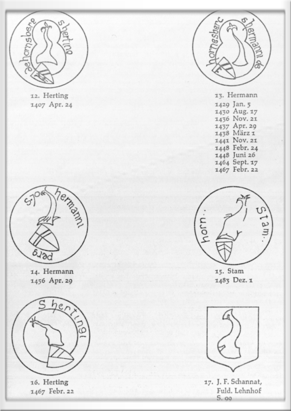 Im Jahre 1458 verkauften Hermann von Hornsburg und sein Sohn Herting III. ihre Fischerei in der Fulda zu Bensefurth an das Kloster Heida. Hier wird zum erstenmal ein Sohn Hermanns erwähnt; ihn selbst und seine Hausfrau Margarethe nennt zum erstenmal eine Urkunde vom Jahre 1470 . Noch einen zweiten Sohn hatte Hermann von Hornsberg, der uns etwas später bekannt wird, Stam, auch Tham und Thammo genannt. Gleich ihren Vorfahren standen beide Brüder, Herting und Stam, in hessischen Diensten. Im hessisch-paderbornischen Krieg von 1464 tritt Herting von Hornsberg als Angreifer des festen Ortes Stadtbergen hervor (Hess.Ztschr .Bd.5, S 270) und als in den hessisch-kölnischen Kämpfen von 1474-76 die Stadt Neuss am Rhein gegen den Herzog Karl den Kühnen von Burgund verteidigt werden musste, war auch Stam von Hornsberg unter den Tapferen, die der Übermacht des hochmütigen Burgunderherzogs trotzten. Stam trug bei der Verteidigung der Stadt eine Verwundung davon (Hess.Ztschr.Bd.6, S 59).