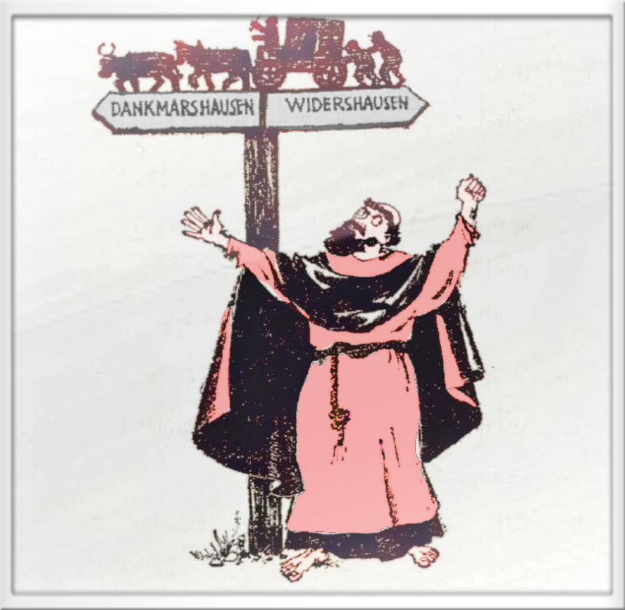 Ergrimmt ob der wenigen Ehrerbietung, schickte er darauf in den nächsten Ort, und hier beeiferten sich die Bewohner um die Wette, ihrem Oberherrn die nöthige Hülfe zu leisten. Er ertheilte ihnen hierauf seinen Segen und die guten Leute zogen, wohlzufrieden damit, in die Heimath zurück. Als nun bald nachher die barbarischen Namen der Ortschaften auch im Werrathale, welches damals zu Fulda gehörte, gegen wohlklingendere vertauscht wurden, da verfügte der Abt, daß hinführo das Dorf, wo ihm die Einwohner, auf seiner Reise, durch Verweigerung ihrer Hülfe zuwider geworden waren, Widershausen genannt werde, das nächste aber, wo sich die Leute als fromme, dem Stifte ergebene Knechte bezeigt hatten, solle, als ein dem Abt wohlgefälliger Ort, den Namen Dankmarshausen führen, bis in die spätesten Zeiten.