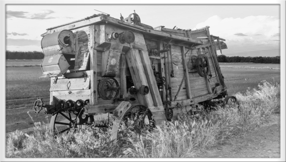 Diese ausgemusterte Dreschmaschine wurde auf einem Feldrain abgestellt und dient jetzt als beeindruckende Fotokulisse.