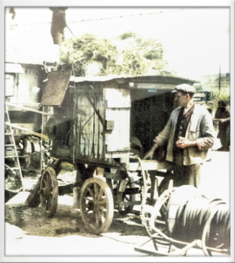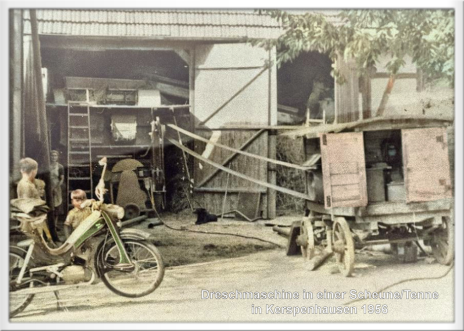 Jahre später (1950) wurde Maschine und Presse zusammengebaut und mit einem Elektromotor angetrieben, der in einem Beiwagen aus Holz montiert war. Mit dem Körnergebläse begann eine weitere Erleichterung. Die Frucht konnte durch Rohre von der Maschine aus direkt auf die dafür vorgesehene Stelle geblasen werden - wieder ein Fortschritt. Wo die Dreschmaschine war, kamen die Kinder hin und freuten sich über ein Stück Streuselkuchen, dieser musste aber oftmals als Beobachter des einlaufenden Getreides durch das Körnergebläse verdient werden - ein schöner Brauch im Dorf.