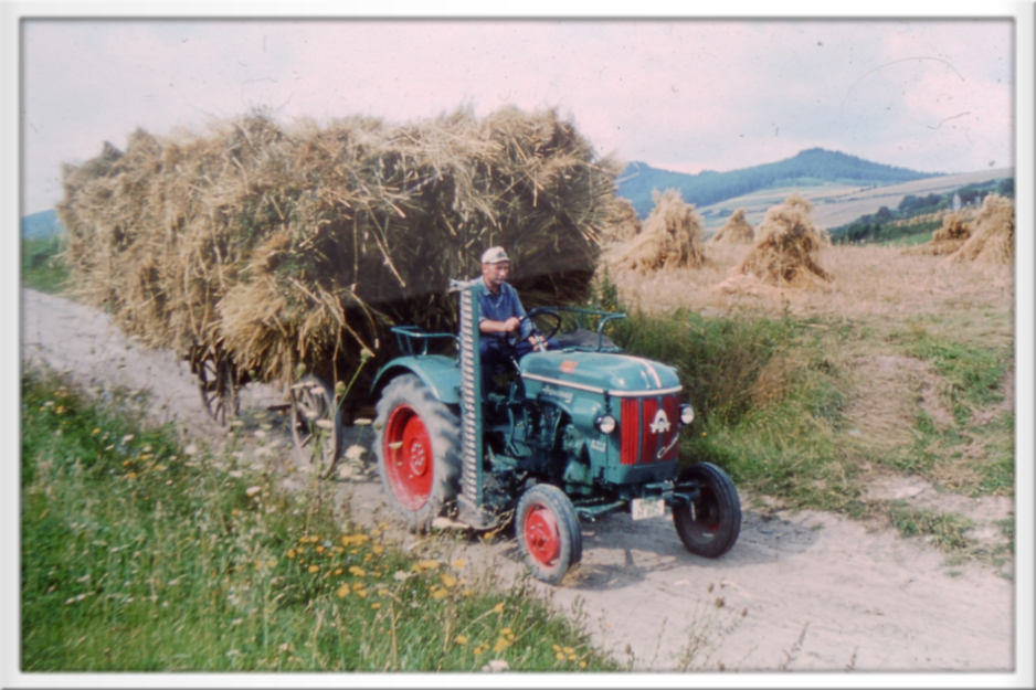 Kurt Ruch (1924-2011) mit seinem Hanomag R435 Traktor mit Leiterwagen beim Heimfahren der ungedroschenen Getreidegarben von der Rüttelsburg um 1965 (Photo: Pfarrer H.-G. Kirchner)