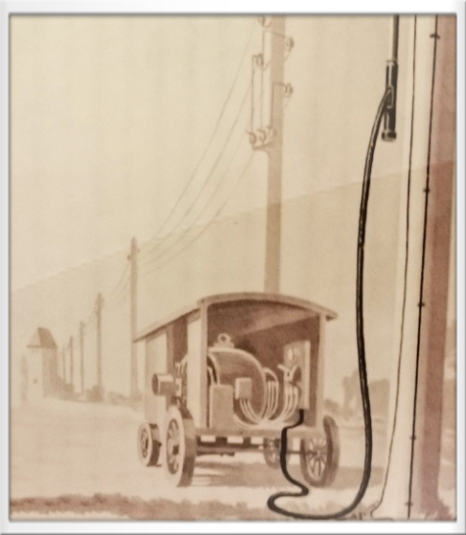 Der Motorwagen mit Elektromotor für die Dreschmaschine wurde natürlich mit Starkstrom betrieben. Da die meisten Haushalte noch keinen Starkstromanschluß hatten, wurde der Motorwagen direkt am Strommasten der Oberleitung angeschlossen.