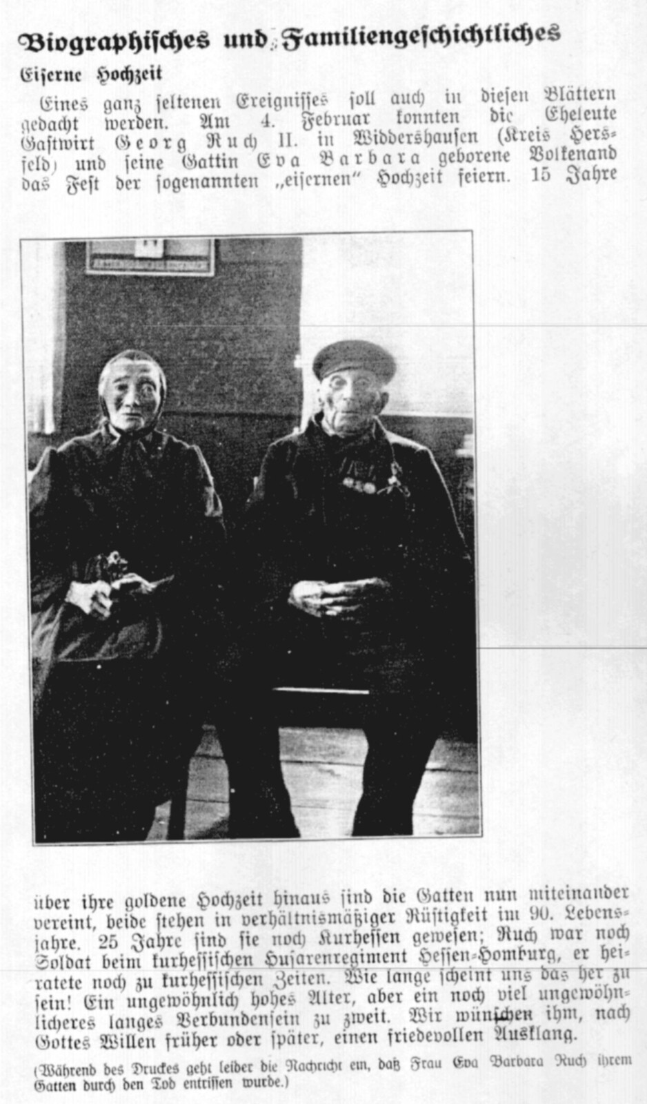 Georg Ruch und Eva Barbara Volkenand wurden 1841 in Widdershausen geboren und heirateten noch zu kurhessischen Zeiten am 04.02.1866 in Widdershausen.