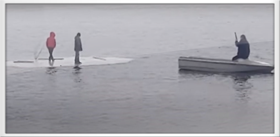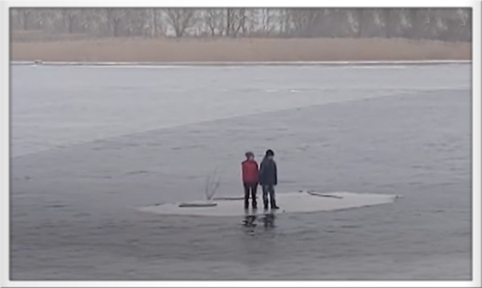 Kinder auf einer treibenden Eisscholle auf einem Fluß in der Ukraine, Rettung naht, Februar 2021