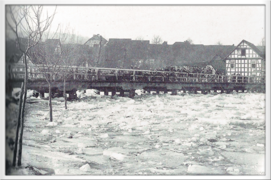 Zum Glück gelang es ihnen noch, sich von der sich allmählich auflösenden Eisscholle auf den Unterbau eines Brückenpfeilers der Widdershäuser Brücke zu retten, so daß sie mit dem Schrecken und nassen Kleidern davon kamen.