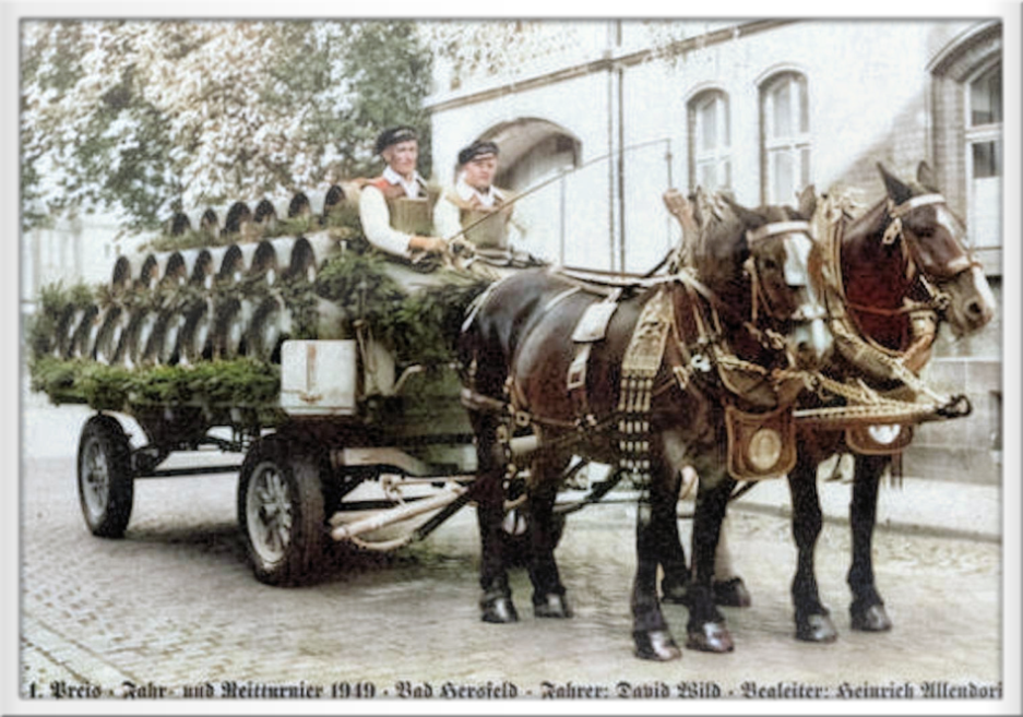 Brauerei-Gespann der Brauerei Wilhelm Engelhardt beim Reit- und Fahrturnier 1949 in Bad Hersfeld, Fahrer: David Wild und Begleiter Heinrich Allendorf