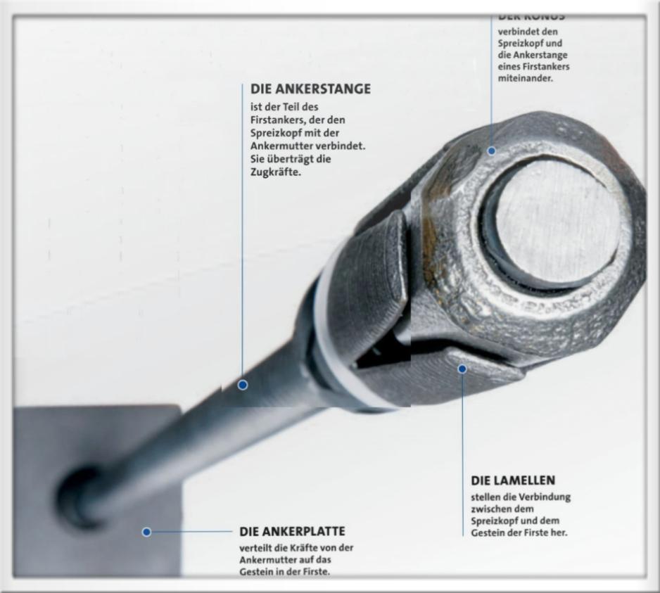 Sicherheit im Kali- und Salzbergbau ist das A und O. Damit die Grubendecken (Firste) intakt bleiben und keine Gesteinsbrocken (Löser) herunterfallen können, werden in regelmäßigen, engen Abständen mindestens 1,2 Meter lange Gewindestangen (Firstanker) ins Gestein getrieben.