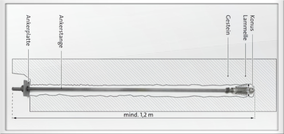 Die Anker haben haben eine Spreizhülse an der Spitze, bei der - einem überdimensionalen Dübel vergleichbar - die Lamellen an die Bohrlochwand gepresst werden und die Salzschichten so miteinander verbinden und stabilisieren.