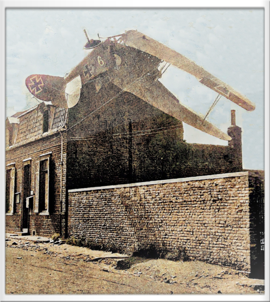 Mit ganz fabelhaftem Fliegerglück stürtzt das Flugzeug auf ein Haus in Montigny en Gohelle.