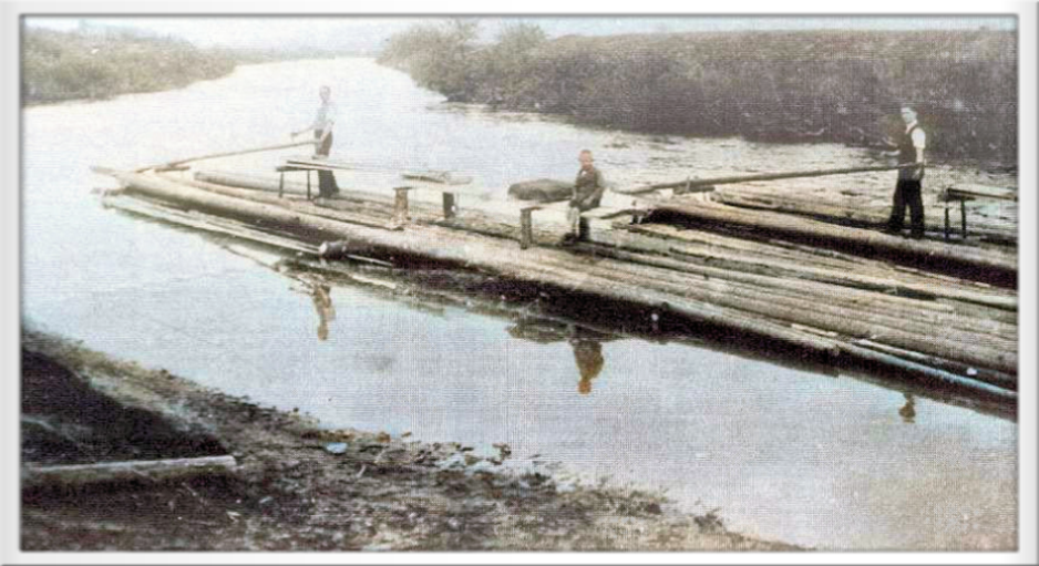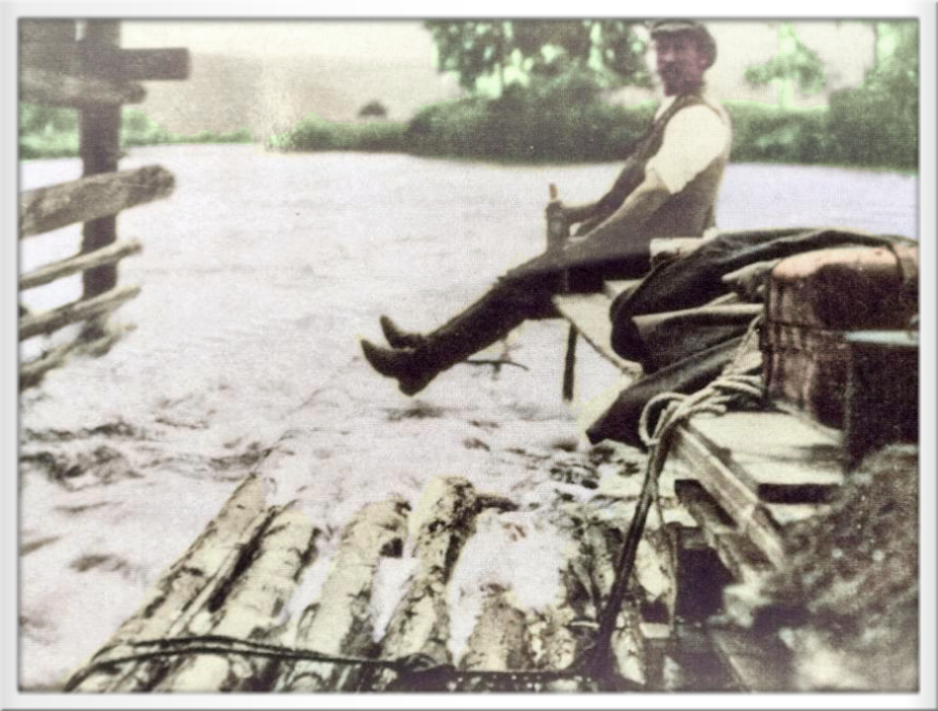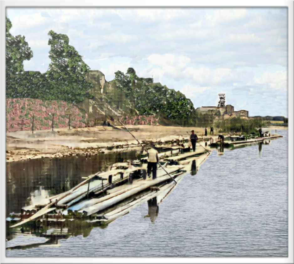 Flößerei auf der Werra in den 20er Jahren in der Nähe von Schacht Neu-Heringen (rechts im Bild erkennt man den Förderturm).
