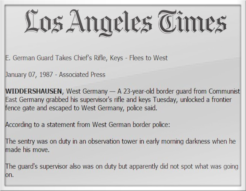 Ein 23-jähriger Angehöriger der Grenztruppen der DDR (im Grenzgebiet nur als VOPOs bekannt) aus dem kommunistischen Ostdeutschland nahm die Maschinenpistole und Schlüssel seines Streifenführers und entriegelte ein verschlossenens Tor am Grenzzaun und entkam nach Westdeutschland, sagte die Polizei.