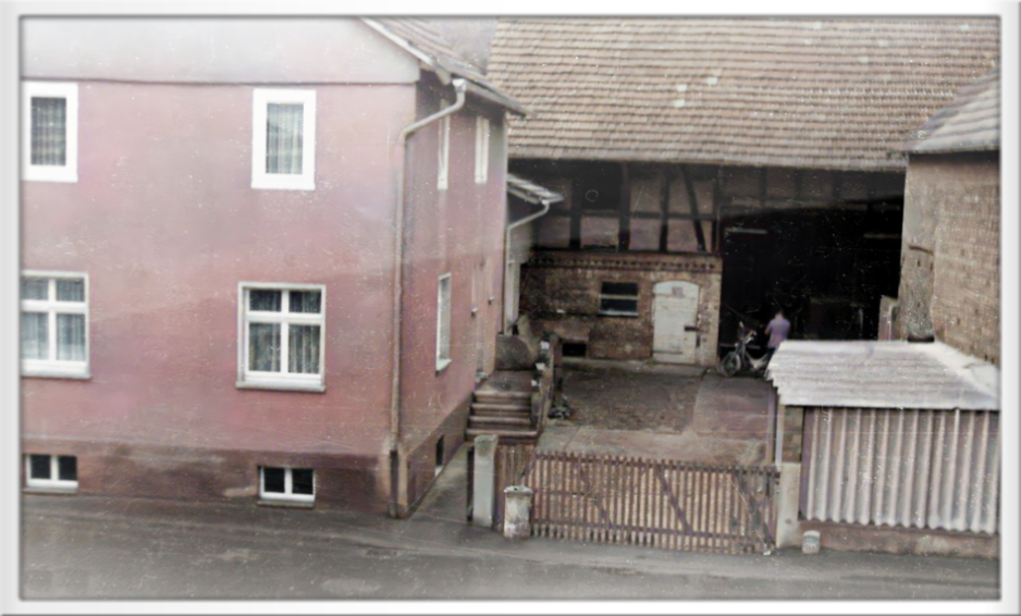 das frühere Haus 31 und Wirtschaftsgebäude des Försters Johannes Koch (später Jordan und Körtzel) in Widdershausen, das Haus stand an der heutigen Felsenstrasse und wurde im Zusammenhang mit den Häusern an der Felswand in den 1970er Jahren abgerissen, Horst Heinz steht vor dem Scheunentor an seiner Mofa.