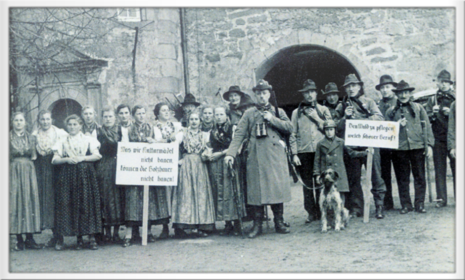 Förster Lohöfer mit Waldarbeiterinnen und Holzhauern im Schloßhof Friedewald im Jahre 1938